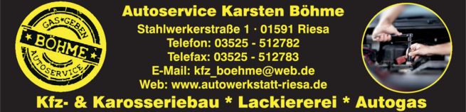 Autoservice Karsten Böhme 03525 51 27 82 Riesa Stahlwerkerstr. 1 01591 Merzdorf https://ies.v4all.de/0122/OETB/0230/4/5984/45845984_200x100px.png 4 5 1