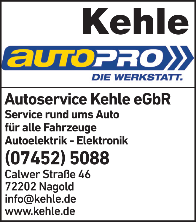 Die Adresse von Autoservice Kehle eGbR Service rund ums Auto lautet: Calwer Str. 46, 72202 Nagold