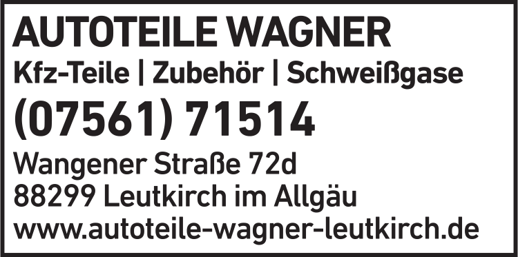 Die Adresse von Autoteile Wagner Fahrzeugservice UG Haftungsbeschränkt lautet: Wangener Str. 72 d, 88299 Leutkirch im Allgäu
