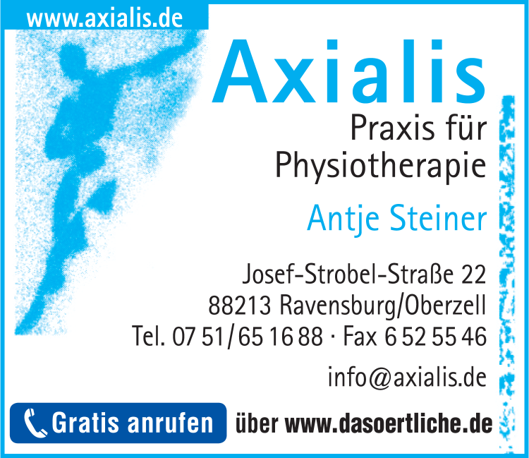 Die Adresse von Axialis Praxis für Physiotherapie lautet: Josef-Strobel-Str. 22, 88213 Ravensburg