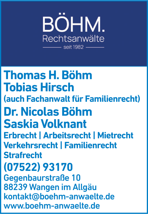 Die Adresse von BÖHM Rechtsanwälte PartGmbB lautet: Gegenbaurstr. 10, 88239 Wangen im Allgäu