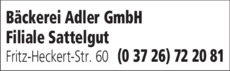 Bäckerei Adler GmbH 03726 72 20 81 Flöha Fritz-Heckert-Str. 60 09557