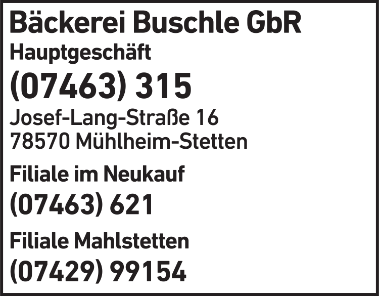 Die Adresse von Bäckerei Buschle GbR lautet: Josef-Lang-Str. 16, 78570 Mühlheim