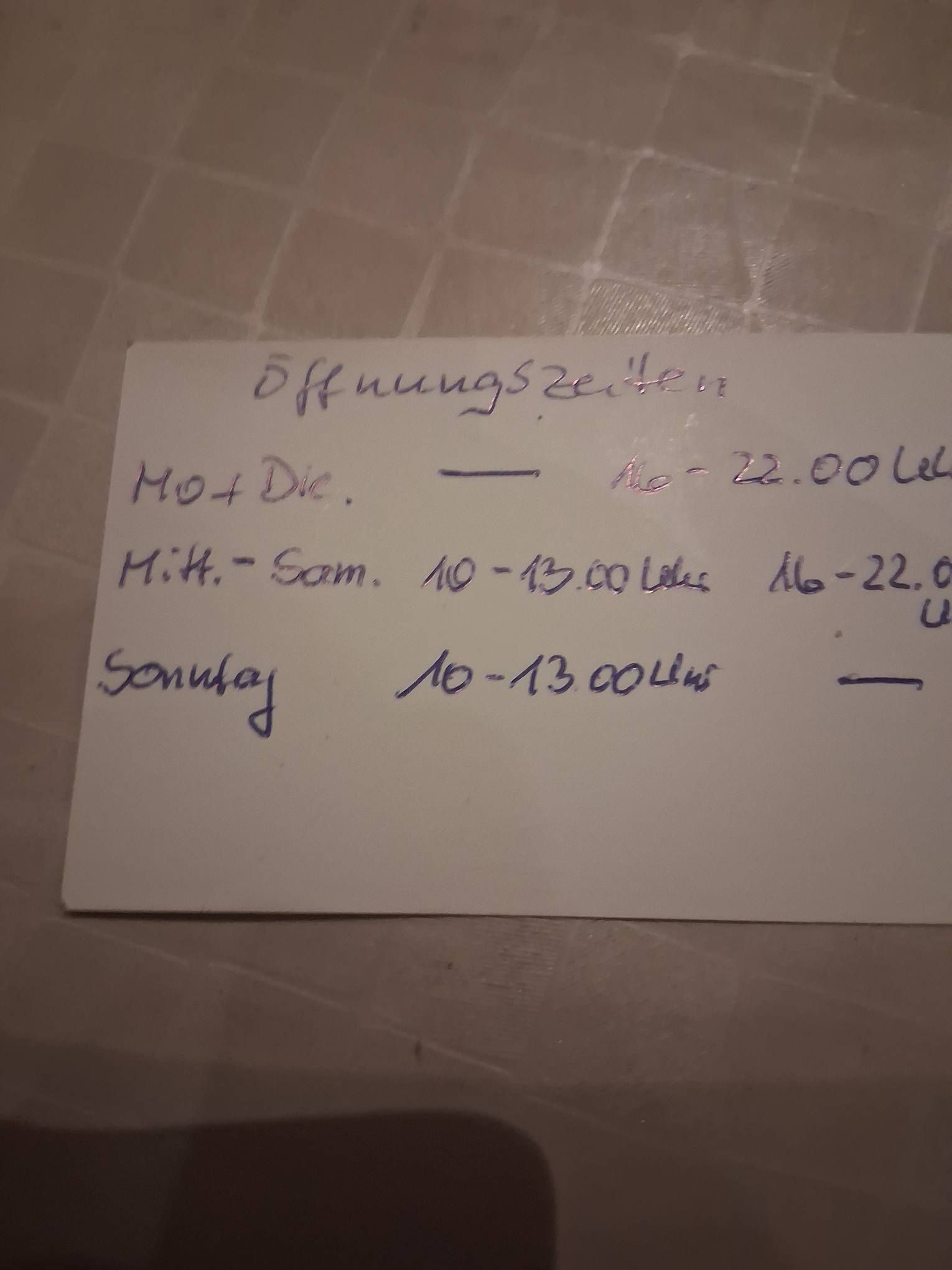 | Donnerstag | 10:00 - 13:00 Uhr, 16:00 - 22:00 Uhr |