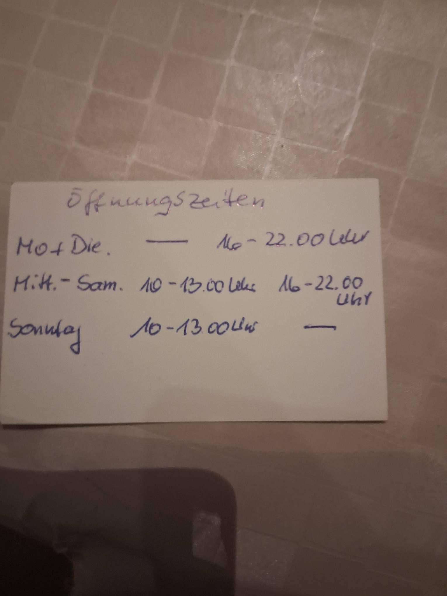 | Freitag | 10:00 - 13:00 Uhr, 16:00 - 22:00 Uhr |