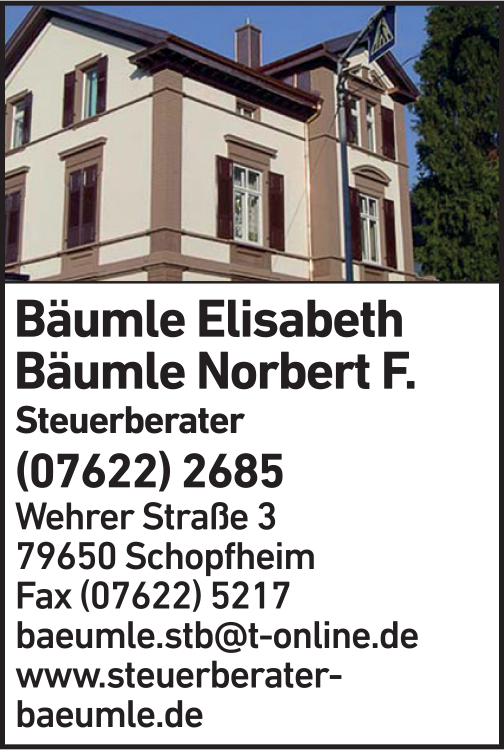 Die Adresse von Bäumle Elisabeth Dipl.-Betriebswirt (BA) Steuerberater lautet: Wehrer Str. 3, 79650 Schopfheim