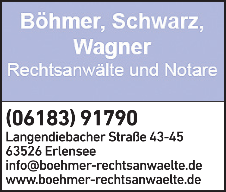 Die Adresse von Böhmer, Schwarz, Wagner Rechtsanwälte & Notare lautet: Langendiebacher Str. 43-45, 63526 Erlensee