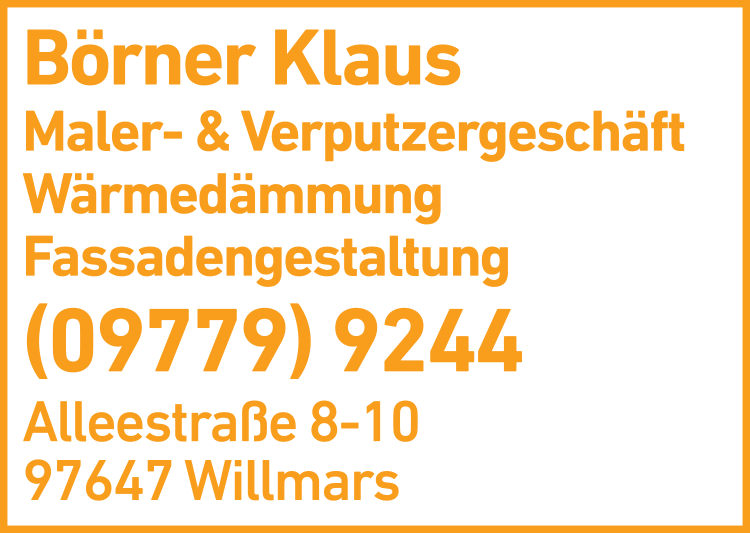Börner Klaus Malergeschäft 09779 92 44 Willmars Alleestr. 8 97647