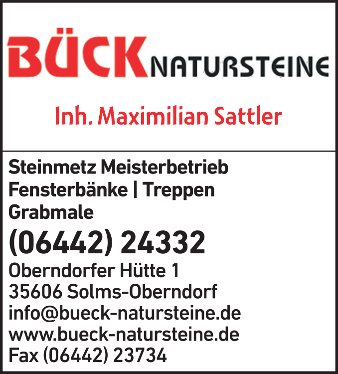 Die Adresse von Bück Naturstein Steinmetzbetrieb lautet: Oberndorfer Hütte, 35606 Solms