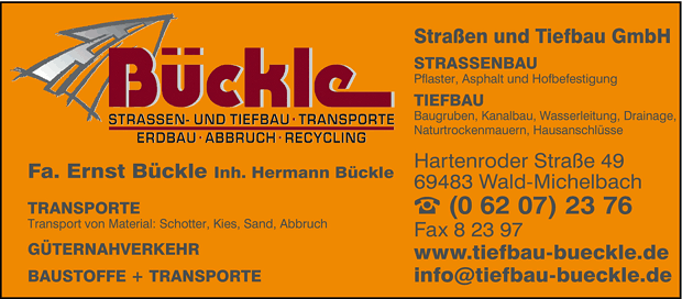 Die Adresse von Bückle Straßen- u. Tiefbau GmbH lautet: Hartenroder Str. 49, 69483 Wald-Michelbach