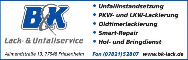 Die Adresse von B & K Lack- & Unfallservice lautet: Allmendstr. 13, 77948 Friesenheim