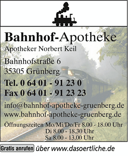 Die Adresse von BAHNHOF - APOTHEKE INH. NORBERT KEIL lautet: Bahnhofstr. 6, 35305 Grünberg