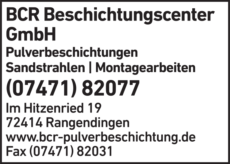 Die Adresse von BCR Beschichtungscenter GmbH lautet: Im Hitzenried 19, 72414 Rangendingen