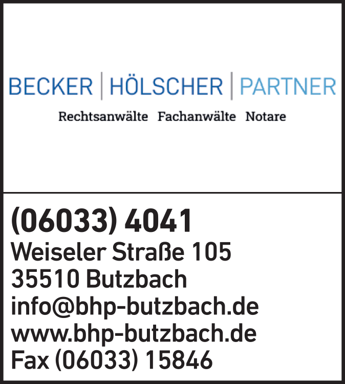 Die Adresse von BECKER HÖLSCHER PARTNER Rechtsanwälte Fachanwälte Notare lautet: Weiseler Str. 105, 35510 Butzbach