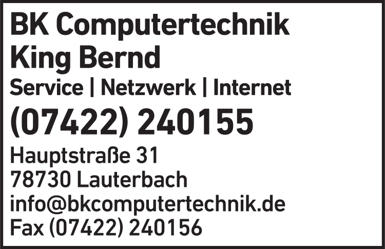 Die Adresse von BK Computertechnik King Bernd lautet: Hauptstr. 31, 78730 Lauterbach