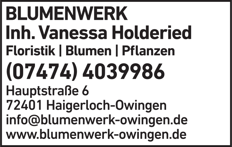 Die Adresse von BLUMENWERK lautet: Hauptstr. 6, 72401 Haigerloch-Owingen