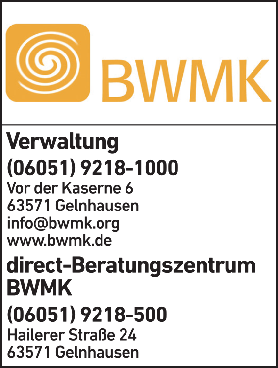 Die Adresse von BWMK (Behinderten-Werk Main-Kinzig) lautet: Vor der Kaserne 6, 63571 Gelnhausen