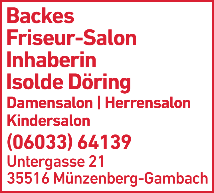 Die Adresse von Backes Friseursalon lautet: Untergasse 21, 35516 Münzenberg-Gambach