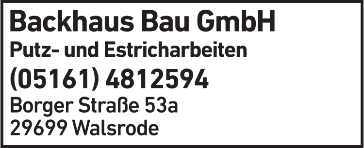 Die Adresse von Backhaus Bau GmbH lautet: Borger Str. 53 a, 29699 Walsrode