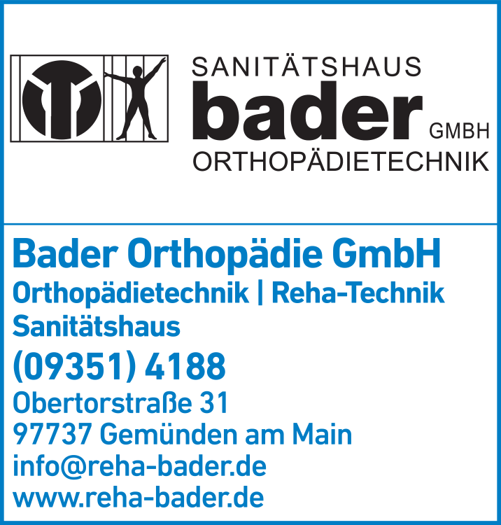 Die Adresse von Bader Orthopädie GmbH lautet: Obertorstr. 31, 97737 Gemünden