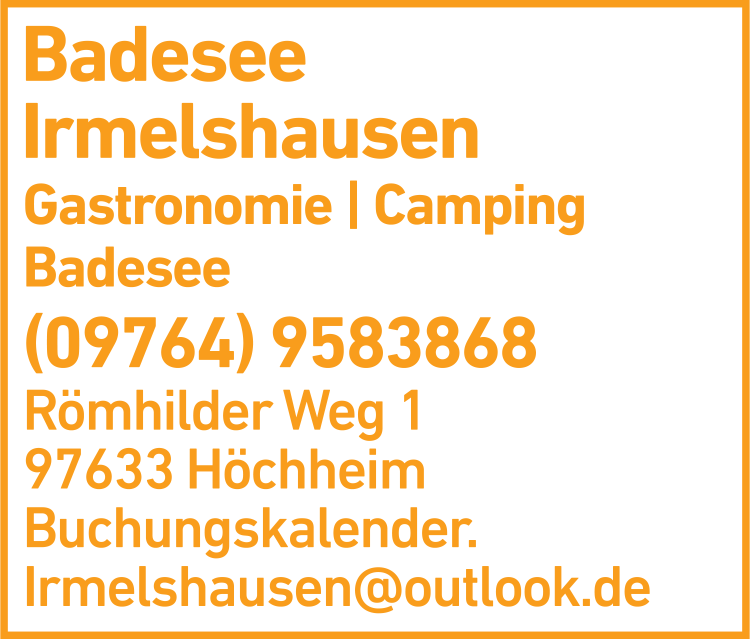 Badesee Irmelshausen Strandbad 09764 9 58 38 68 Höchheim-Irmelshausen Römhilder Weg 1 97633 Irmelshausen
