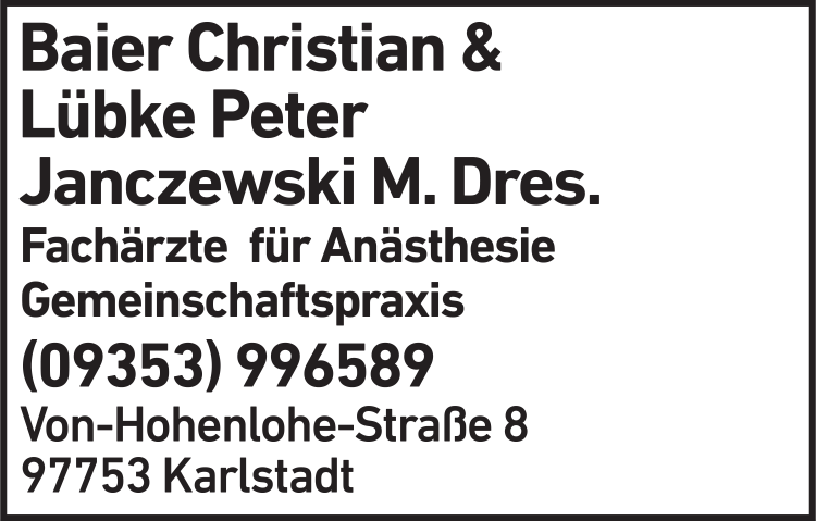 Die Adresse von Baier, Lübke, Janczewski Anästhesiologie lautet: Von-Hohenlohe-Str. 8, 97753 Karlstadt