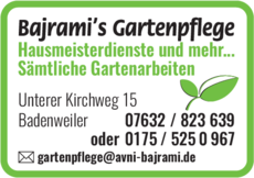 Die Adresse von Bajrami's Gartenpflege lautet: Unterer Kirchweg 15, 79410 Badenweiler