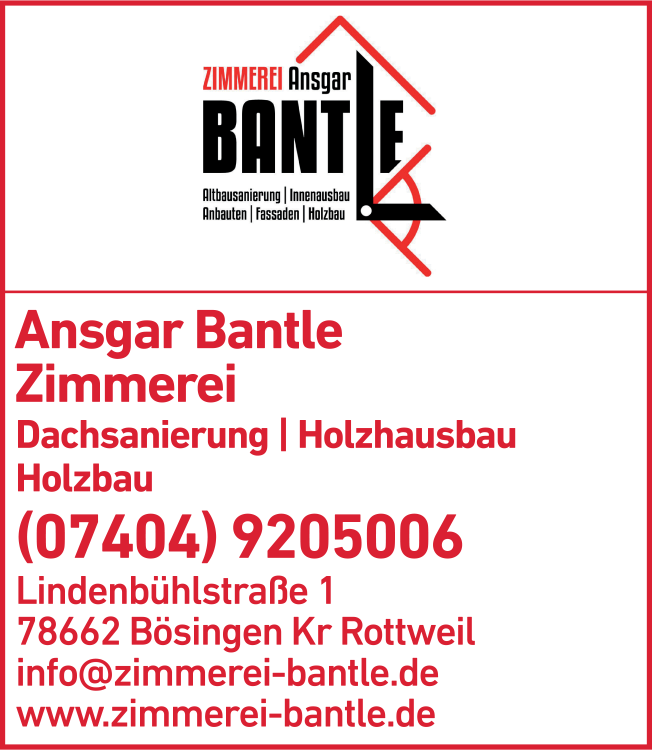 Bantle Ansgar Zimmerei 07404 9 20 50 06 Bösingen Lindenbühlstr. 1 78662