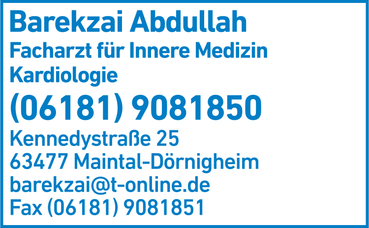 Die Adresse von Barekzai Abdullah Facharzt für Innere Medizin lautet: Kennedystr. 25, 63477 Maintal