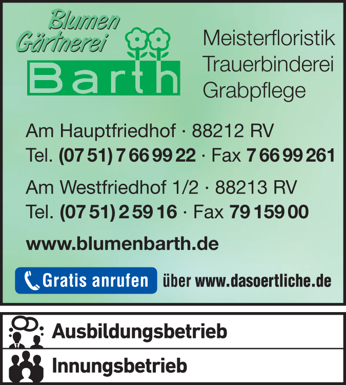 Die Adresse von Barth Daniel Blumen lautet: Wassertreter 26/1, 88212 Ravensburg