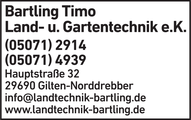 Die Adresse von Bartling Timo Land- u. Gartentechnik e.K. lautet: Hauptstr. 32, 29690 Gilten