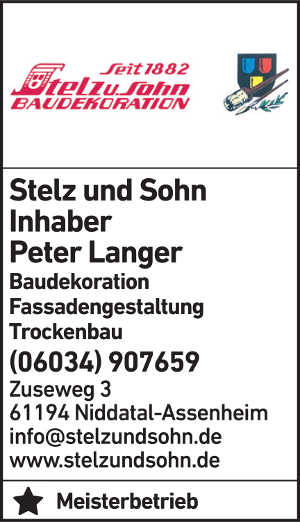 Die Adresse von Baudekoration Stelz u. Sohn Inh. Peter Langer lautet: Zuseweg 3, 61194 Niddatal-Assenheim