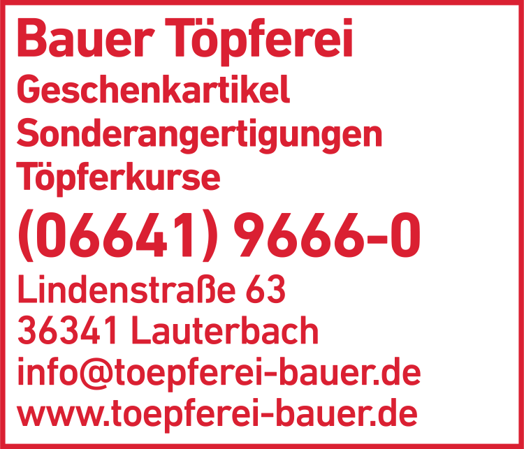 Die Adresse von Bauer Töpferei lautet: Lindenstr. 63, 36341 Lauterbach (Hessen)