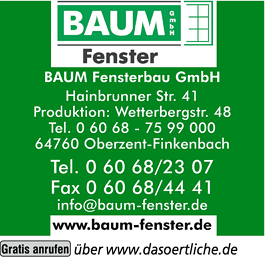 Die Adresse von Baum Fensterbau GmbH lautet: Hainbrunner Str. 41, 64760 Oberzent