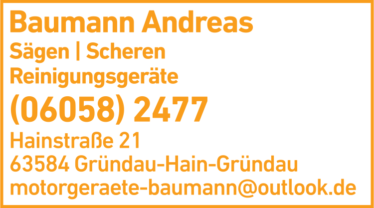 Die Adresse von Baumann Andreas Forst- u. Gartengeräte lautet: Hainstr. 21, 63584 Gründau