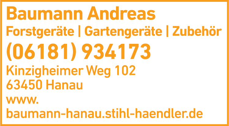 Die Adresse von Baumann Andreas Forst- u. Gartengeräte lautet: Kinzigheimer Weg 102, 63450 Hanau