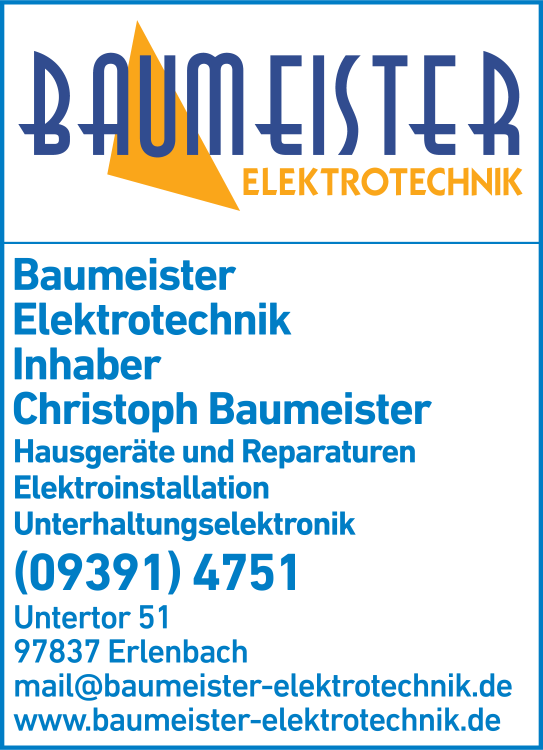 Die Adresse von Baumeister Christoph Elektrotechnik lautet: Untertor 51, 97837 Erlenbach