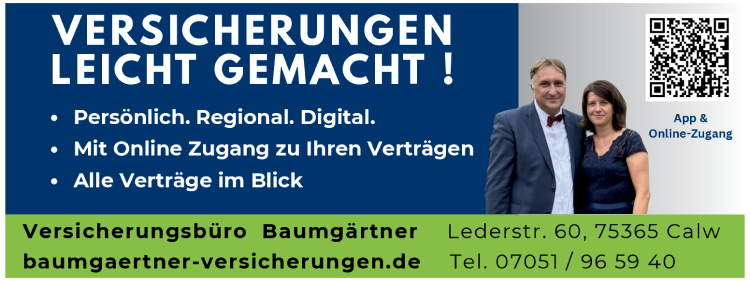Die Adresse von Baumgärtner Werner Versicherungsbüro lautet: Lederstr. 60, 75365 Calw