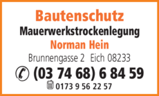 Die Adresse von Bautenschutz Hein Norman lautet: Brunnengasse 2, 08233 Eich