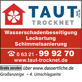 Bautrocknung Taut GmbH u. Co. KG 06321 99 92 70 Neustadt an der Weinstraße Geschwister-Scholl-Str. 19 67433 https://media.roeser-online.de/02/123/LOGO/000/291/116_200x100.png
