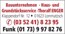 Die Adresse von Bauunternehmen - Haus- u. Grundstücksservice THORALF ENGER lautet: Klappendorf 12, 01623 Lommatzsch