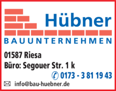 Die Adresse von Bauunternehmen Jörg Hübner lautet: Segouer Str. 1 k, 01587 Riesa