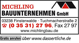 Die Adresse von Bauunternehmen Michling GmbH lautet: Tuchmacherstr. 2, 03238 Finsterwalde