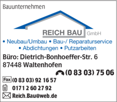 Die Adresse von Bauunternehmen Reich Bau GmbH lautet: Dietrich-Bonhoeffer-Str. 6, 87448 Waltenhofen