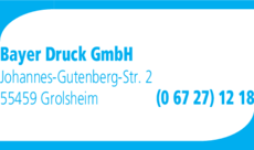 Die Adresse von Bayer Druck GmbH lautet: Johannes-Gutenberg-Str. 2, 55459 Grolsheim