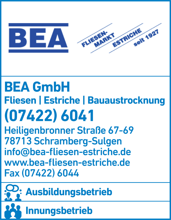 Bea GmbH Fliesenmarkt + Estriche Fliesenfachgeschäft 07422 60 41 Schramberg Heiligenbronner Str. 67-69 78713 Sulgen
