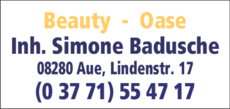 Die Adresse von Beauty-Oase Simone Badusche lautet: Lindenstr. 17, 08280 Aue