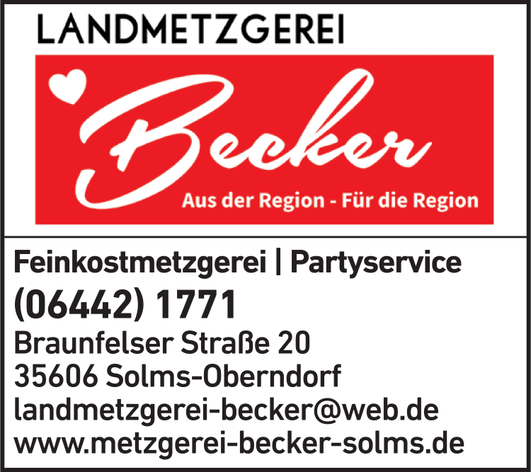 Die Adresse von Becker Thomas Landmetzgerei lautet: Braunfelser Str. 20, 35606 Solms-Oberndorf