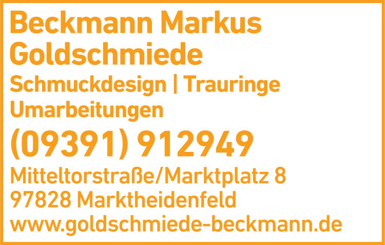 Die Adresse von Beckmann Markus Goldschmiede Gold- und Silberschmuck lautet: Mitteltorstr./Marktplatz 8, 97828 Marktheidenfeld