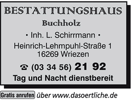 Die Adresse von Beerdigung BESTATTUNGSHAUS Buchholz lautet: Heinrich-Lehmpuhl-Str. 1, 16269 Wriezen